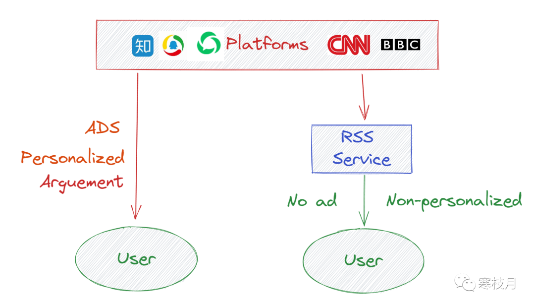 2. Use RSS and Newsletter. These information sources help you avoid being fed with something you like. It can also filter ads. Alternatively, you can disable "Personalized recommendation" on social media, if possible. This illustration shows how RSS works: