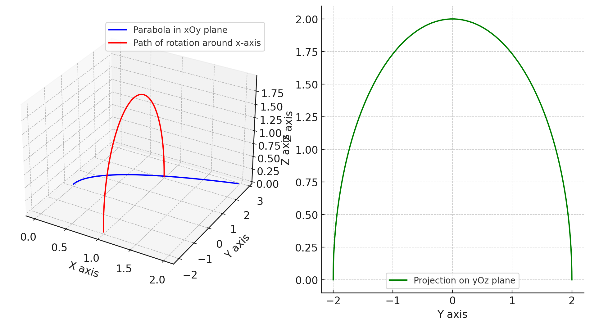 这张图演示了平面上的抛物线绕x轴旋转180度的图像。右边是正面视角,不难看出: